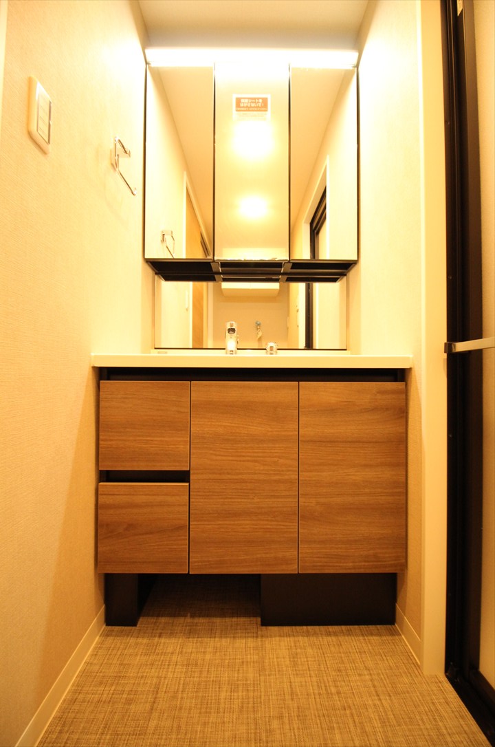 LIXIL製洗面化粧台交換、洗濯用防水パン、水栓交換、吊戸棚取付
