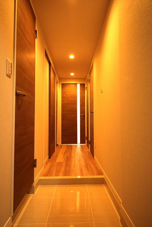 玄関収納新規交換、人感センサー取付、床タイル張替え